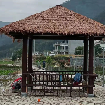 茅草亭子指的是在防腐木亭子上面蓋一層茅草,可以是真茅草,也可以是仿真茅草,一般仿真茅草用得比較多一些,我們是專業的防腐木茅草亭生產廠家,可定做各種款式的四角茅草亭、六角茅草亭等。