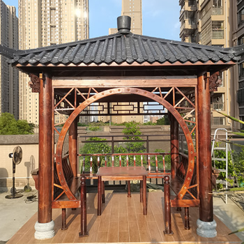 樹脂瓦四角涼亭采用實木制作而成,頂部蓋樹脂瓦,下面配石墩,這樣堅固耐用,是一款受到用戶喜愛的防腐木涼亭。